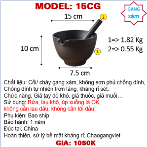 Đường kính 15cm, cao 10 cm, cân nặng cối 1.82 Kg, chày 0.55Kg, đáy 7.5cm.