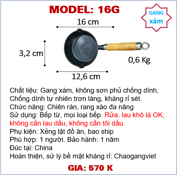 - Mô tả 1. Chất liệu : Gang xám đã sử lý kháng rỉ sét - Tay cầm gỗ tốt, liên kết bằng ti/ khâu inox 304 bền chắc, không rỉ sét.2. Thông số:Đường kính 16cm, cao 3,2cm, cân nặng ~0,6 Kg, đáy tiếp xúc bếp từ 12,6cmĐặc biệt: Chống dính tự nhiên an toàn, không sơn phủ chống dính công nghiệp. Lòng chảo mịn bóng, đã sử lý chống rỉ sét, tôi dầu OK khách hàng sẵn dùng như một chiếc chảo bình thường.Dùng được trên mọi loại bếp, tốt nhất trên bếp từ. Bắt từ nhanh, giữ nhiệt lâu, chịu được nhiệt độ cao, không cong vênh lồi đít, chịu được va chạm với dụng dụ nấu ăn kim loại hay bùi nhùi sắt.3. Chức năng : Chuyên chiên rán. Phù hợp với gia đình 1-2 người.4. Phụ kiện: Bao ship.5. HDSD đi kèm chảo:- Chảo gang thô mới dùng lần đầu có xu hướng thấm dầu ăn, nên ta cho đủ dầu ăn láng đều trơn láng tự do trong lòng chảo, chờ dầu ăn nóng già (gần bốc khói) thì hãy cho đồ ăn vào là không bị dính chảo.- Vệ sinh chảo đơn giản chỉ là rửa sạch với nước rửa bát, lau khô, để nơi thông thoáng là không bị rỉ sét.6. Bảo hành: 1 Năm từ ngày mua. Khách hàng nhận sản phẩm kiểm tra ngoại OK là OK, nếu lỗi do NSX sẽ đổi ngay lập tức.Từ chối bảo hành các lí do như khách hàng đánh rơi vỡ, chèn ép gây nứt, đổ nước lạnh vào chảo khi đang nóng gây nứt...