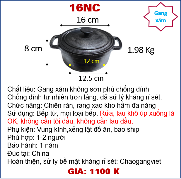 Đường kính 16cm, cao 8cm, cân nặng ~1.98Kg, đáy tiếp xúc bếp từ ~ 12.5cm, lòng ~12cm