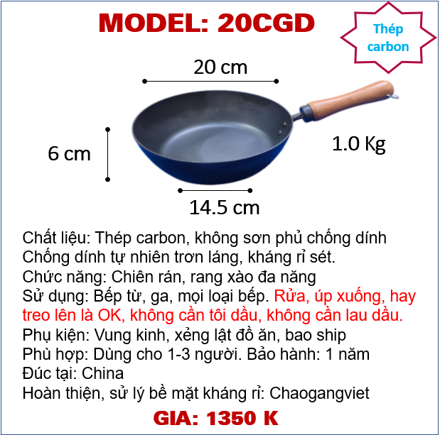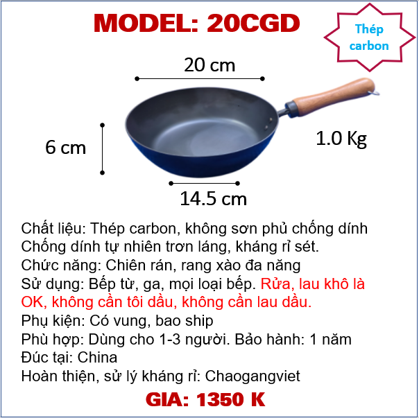 Kích thước đường kính miệng 20cm, cao 6 cm, cân nặng 1.0 kg , tay cầm gỗ rất tiện lợi, phù hợp cho những người thích nhẹ nhàng.