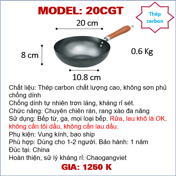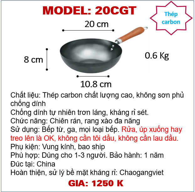 Kích thước đường kính miệng 20cm, cao 8.5cm, cân nặng 0.6kg , tay cầm gỗ rất tiện lợi, phù hợp cho những người thích nhẹ nhàng.