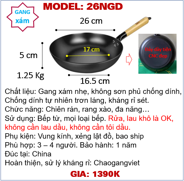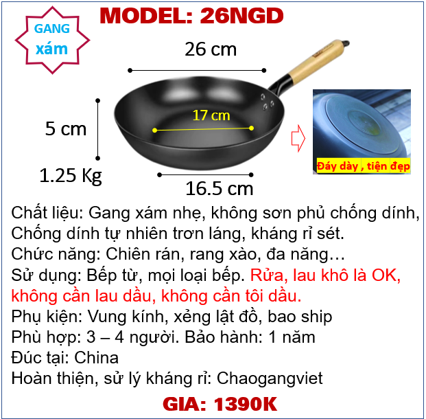 2. Thông số: Đường kính 26cm, cao 5cm, cân nặng ~1.35 Kg/ 1.4kg, đáy tiếp xúc bếp từ 17cm/ 15cm