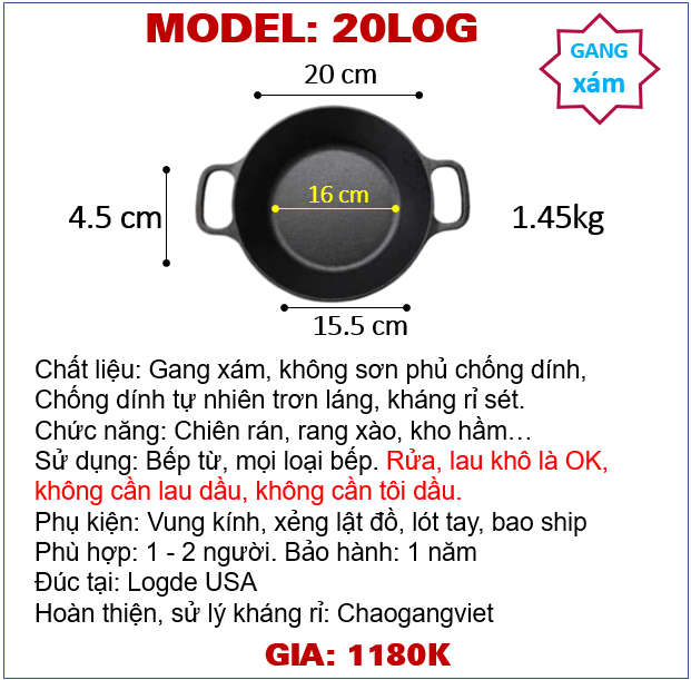 1. Chất liệu : Gang xám hãng Logde sản xuất tại Mỹ => Đã sử lý kháng rỉ theo std chaogangviet