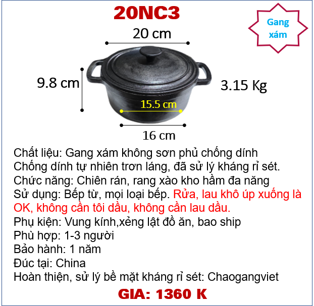 Đường kính 20cm, cao 9.8cm, cân nặng ~3.15Kg, đáy tiếp xúc bếp từ ~ 16cm, lòng ~15.5cm