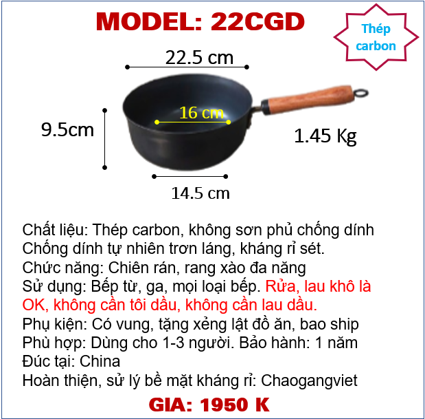 - Kích thước đường kính miệng 22cm, cao 9.5cm, cân nặng 1.45kg, đáy tiếp xúc bếp từ 14.5cm, lòng chảo 16cm, dày dặn láng mịn, tay cầm gỗ rất tiện lợi, phù hợp cho những người thích nhẹ nhàng.