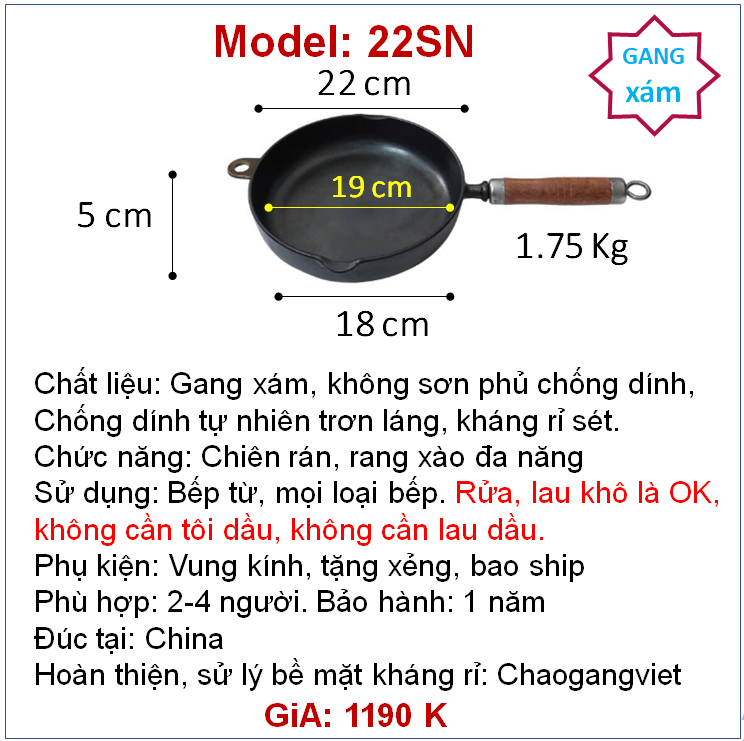 Đường kính 22cm, cao 5cm, cân nặng ~1.75 Kg, đáy tiếp xúc bếp từ 18cm