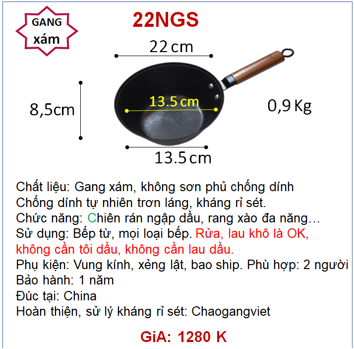 Đường kính 22 cm, cao 8,5cm, cân nặng ~0,9Kg, lòng chảo 13,5cm, đáy tiếp xúc bếp từ 13,5cm