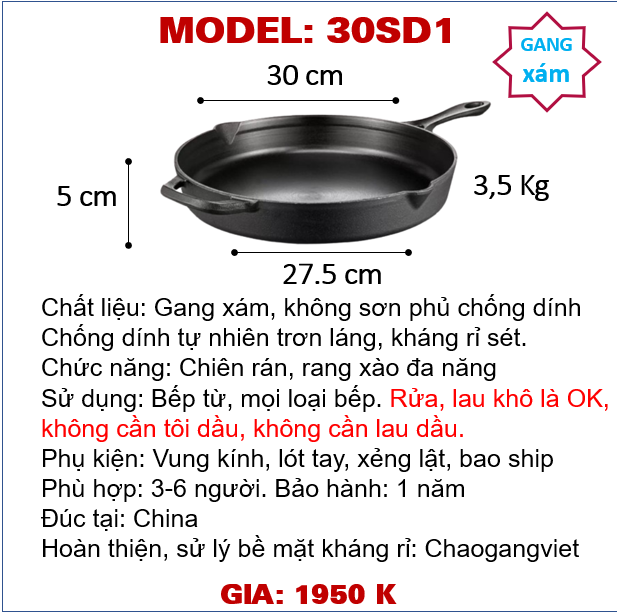 30SD1 Chảo gang xám (Tiện lòng CNC láng mịn) chiên rán đa năng