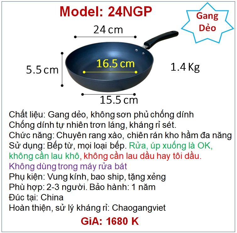 Đường kính 24 cm, cao 5,5cm, cân nặng ~1,4 Kg, tay cầm nhựa chống nóng cao cấp, đáy tiếp xúc bếp từ 15,5 cm