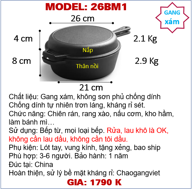 Đường kính 26cm, Chảo chính cao 8cm, cân nặng ~2,9Kg, đáy tiếp xúc bếp từ 21cm