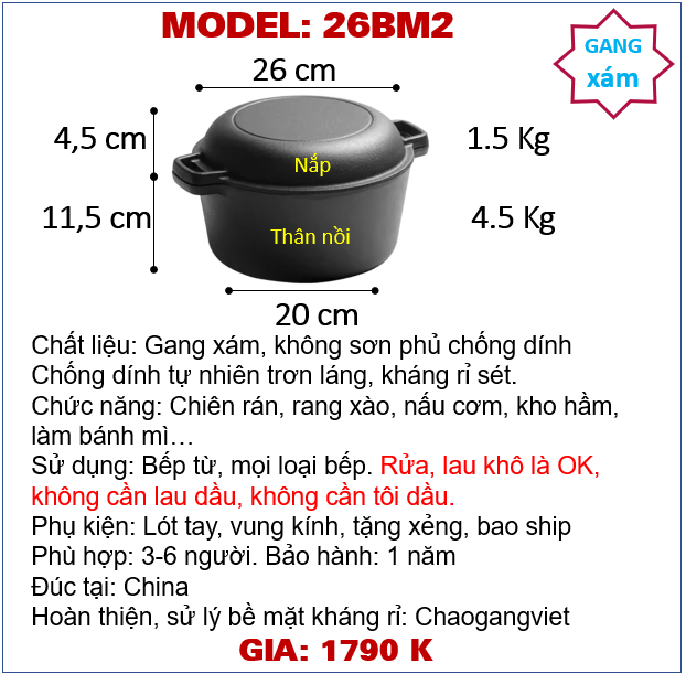 Đường kính 26cm, Chảo chính cao 11.5cm, cân nặng ~4.5Kg, đáy tiếp xúc bếp từ 20cm