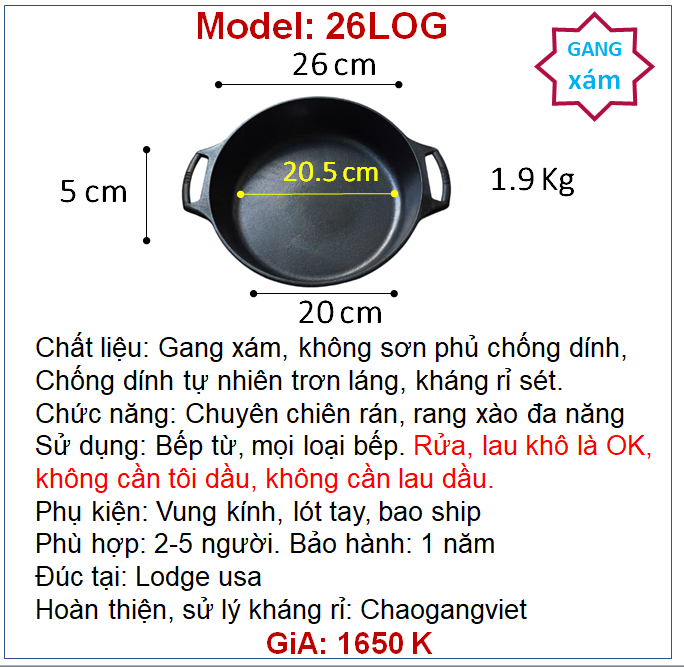 Đường kính 26cm, cao 5cm, cân nặng ~1.9Kg, đáy tiếp xúc bếp từ 20cm, lòng chảo 20,5cm