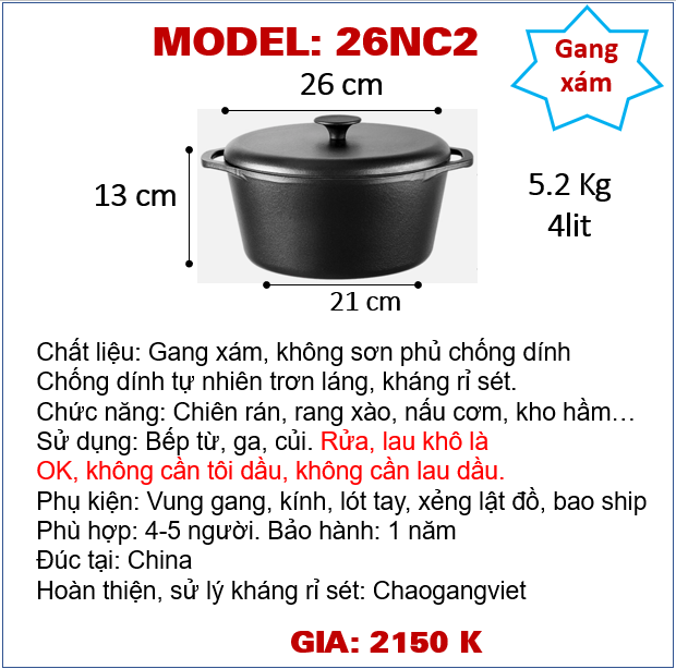 - Mô tả 1. Chất liệu : Gang xám nhẹ - Đã sử lý kháng rỉ sét.2. Thông số: Đường kính 26cm, cao 13cm, cân nặng ~5.2 Kg, đáy tiếp xúc bếp từ 21cmĐặc biệt: Chống dính tự nhiên an toàn, không sơn phủ chống dính công nghiệp. Lòng chảo mịn bóng, đã sử lý chống rỉ sét, tôi dầu OK khách hàng sẵn dùng như một chiếc chảo bình thường. Không cần tôi dầu, không cần lau dầu, chỉ cần rửa sạch-lau khô-treo nơi thông thoáng là chảo không bị rỉ.Dùng được trên mọi loại bếp, tốt nhất trên bếp từ. Bắt từ nhanh, giữ nhiệt lâu, chịu được nhiệt độ cao, không cong vênh lồi đít, chịu được va chạm với dụng cụ nấu ăn kim loại hay bùi nhùi sắt.3. Chức năng : Chiên rán, rang xào, nấu cơm, kho cá, đa năng... Phù hợp với gia đình 3-5 người.4. Phụ kiện: Vung kính, lót tay, xẻng lật đồ, bao ship.5. HDSD đi kèm chảo:- Nồi gang thô mới dùng lần đầu có xu hướng thấm dầu ăn, nên ta cho đủ dầu ăn láng đều trơn láng tự do trong lòng chảo, gia nhiệt ở nhiệt độ trung bình tầm 4-5 phút cho dầu ăn nóng già (gần bốc khói) thì hãy cho đồ ăn vào là không bị dính chảo.- Vệ sinh và bảo quản nồi chảo gang: