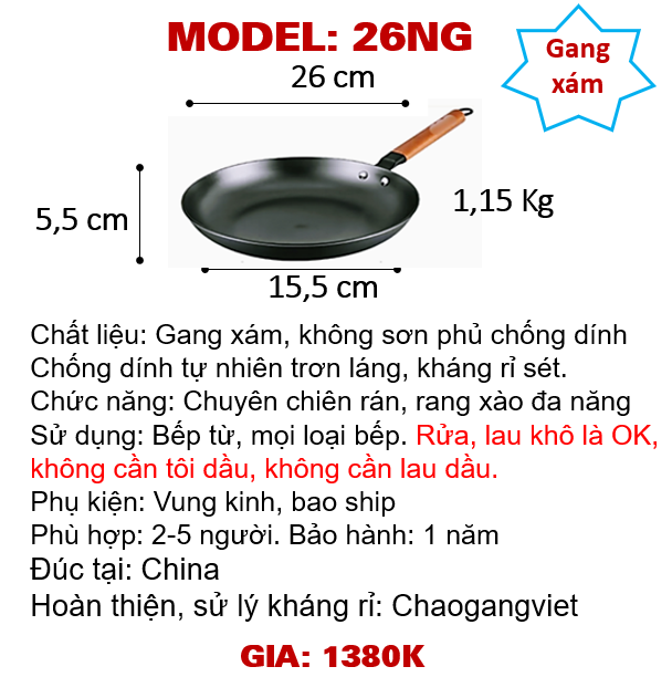 - Mô tả 1. Chất liệu : Gang xám, dòng gang nhẹ2. Thông số:Đường kính 26 cm, cao 5,5cm, cân nặng ~1,15 Kg, đáy tiếp xúc bếp từ 15,5cmĐặc biệt: Chống dính tự nhiên an toàn, không sơn phủ chống dính công nghiệp. Lòng chảo mịn bóng, đã sử lý chống rỉ sét, tôi dầu OK khách hàng sẵn dùng như một chiếc chảo bình thường.Dùng được trên mọi loại bếp, tốt nhất trên bếp từ. Bắt từ nhanh, giữ nhiệt lâu, chịu được nhiệt độ cao, không cong vênh lồi đít, chịu được va chạm với dụng cụ nấu ăn kim loại hay bùi nhùi sắt.3. Chức năng : Chuyên chiên rán, rang xào đa năng. Phù hợp với gia đình 5-6 người.4. Phụ kiện: Vung kính, chổi lau dầu silicon, bao ship.5. HDSD đi kèm chảo:- Chảo gang thô mới dùng lần đầu có xu hướng thấm dầu ăn, nên ta cho đủ dầu ăn láng đều trơn láng tự do trong lòng chảo, chờ dầu ăn nóng già (gần bốc khói) thì hãy cho đồ ăn vào là không bị dính chảo.- Vệ sinh chảo đơn giản chỉ là rửa sạch với nước rửa bát, lau khô, để nơi thông thoáng là không bị rỉ sét.6. Bảo hành: 1 Năm từ ngày mua. Khách hàng nhận sản phẩm kiểm tra ngoại OK là OK, nếu lỗi do NSX sẽ đổi ngay lập tức.Từ chối bảo hành các lí do như khách hàng đánh rơi vỡ, chèn ép gây nứt, đổ nước lạnh vào chảo khi đang nóng gây nứt...