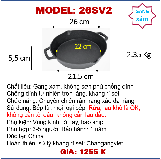 Đường kính 26cm, cao 5.5cm, cân nặng ~2.35 Kg, lòng chảo 22cm, đáy tiếp xúc bếp từ 21,5cm