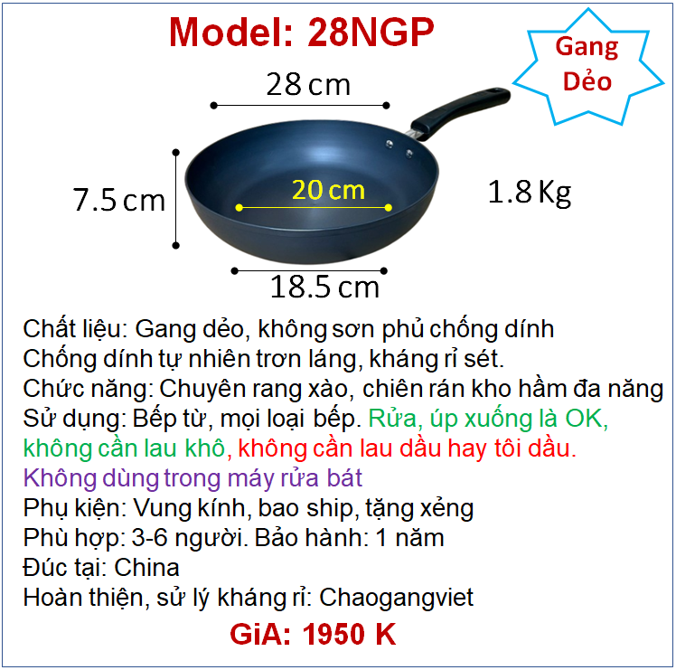 - Mô tả 1. Chất liệu : Gang DẺO, dòng gang nhẹ2. Thông số:Đường kính 28 cm, cao 7,5cm, cân nặng ~1,8 Kg, đáy tiếp xúc bếp từ 18.5 cm, lòng chảo 20cm.Đặc biệt: Chống dính tự nhiên an toàn, không sơn phủ chống dính công nghiệp. Lòng chảo mịn bóng, đã sử lý chống rỉ sét, tôi dầu OK khách hàng sẵn dùng như một chiếc chảo bình thường. Không cần tôi dầu, không cần lau dầu.Đặc biệt chỉ cần rửa sạch treo nơi thông thoáng là chảo không bị rỉ.Dùng được trên mọi loại bếp, tốt nhất trên bếp từ. Bắt từ nhanh, giữ nhiệt lâu, chịu được nhiệt độ cao, không cong vênh lồi đít, chịu được va chạm với dụng cụ nấu ăn kim loại hay bùi nhùi sắt.3. Chức năng : Chuyên chiên rán, rang xào, kho hầm, nấu canh, đa năng. Phù hợp với gia đình 4-6 người.4. Phụ kiện: Vung kính, bao ship.5. HDSD đi kèm chảo:- Chảo gang thô mới dùng lần đầu có xu hướng thấm dầu ăn, nên ta cho đủ dầu ăn láng đều trơn láng tự do trong lòng chảo, chờ dầu ăn nóng già (gần bốc khói) thì hãy cho đồ ăn vào là không bị dính chảo.- Vệ sinh chảo đơn giản chỉ là rửa sạch với nước rửa bát, treo nơi thông thoáng để chảo không bị rỉ sét.6. Bảo hành: 1 Năm từ ngày mua. Khách hàng nhận sản phẩm kiểm tra ngoại OK là OK, nếu lỗi do NSX sẽ đổi ngay lập tức.Từ chối bảo hành các lí do như khách hàng đánh rơi vỡ, chèn ép gây nứt, đổ nước lạnh vào chảo khi đang nóng gây nứt...#28NGP