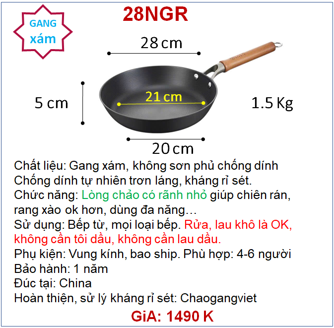 Đường kính 28 cm, cao 5cm, cân nặng ~1,35 Kg, đáy tiếp xúc bếp từ 20 cm, lòng chảo 21cm