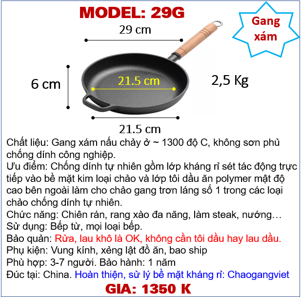 - Mô tả 1. Chất liệu : Gang xám nấu chảy ở ~ 1300 độ C, không sơn phủ chống dính công nghiệp.2. Thông số:Đường kính 29cm, cao 6cm, cân nặng ~2,5 Kg, đáy tiếp xúc bếp từ 21.5cm, lòng chảo 21.5cm.Đặc biệt: Chống dính tự nhiên gồm lớp kháng rỉ sét tác động trực tiếp vào bề mặt kim loại chảo và lớp tôi dầu ăn polymer mật độ cao bên ngoài làm cho chảo gang trơn láng số 1 trong các loại chảo chống dính tự nhiên.