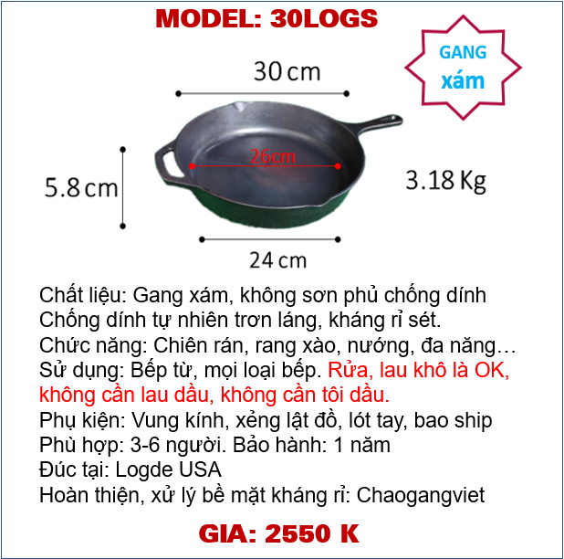 Đường kính 30cm, cao 5.8cm, cân nặng ~3.18Kg, đáy tiếp xúc bếp từ ~24cm, lòng chảo ~26cm