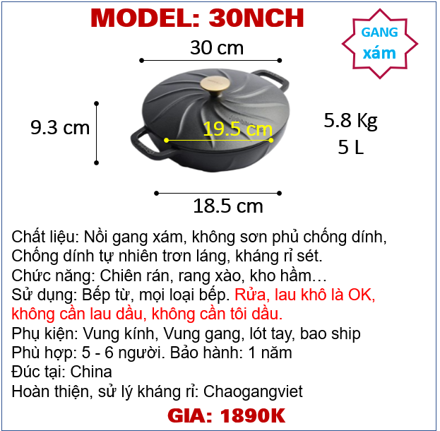 Đường kính 30cm, cao 9.3cm, cân nặng nồi 5.8 Kg, vung gang, đáy tiếp xúc bếp từ ~18.5 cm, lòng chảo 19.5cm