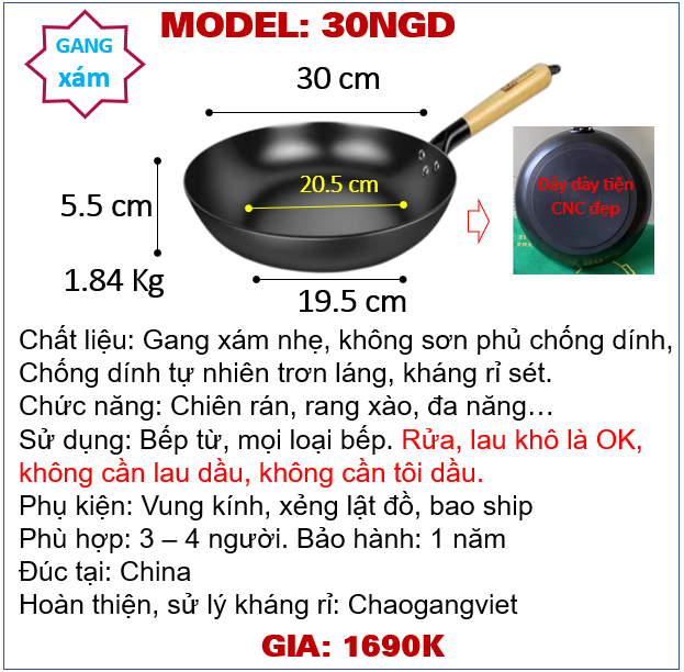 2. Thông số: Đường kính 30cm, cao 5.5cm, cân nặng ~1.84 Kg, đáy tiếp xúc bếp từ 19.5cm, lòng chảo 20.5cm.