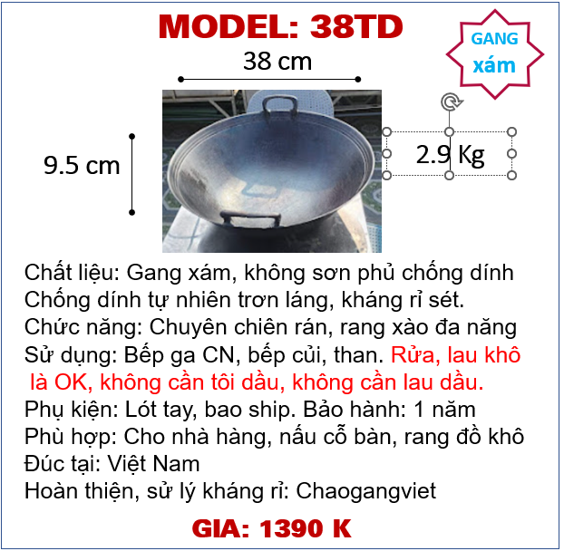 Đường kính 38cm, cao 9.5cm, cân nặng ~2.9Kg, đáy bầu