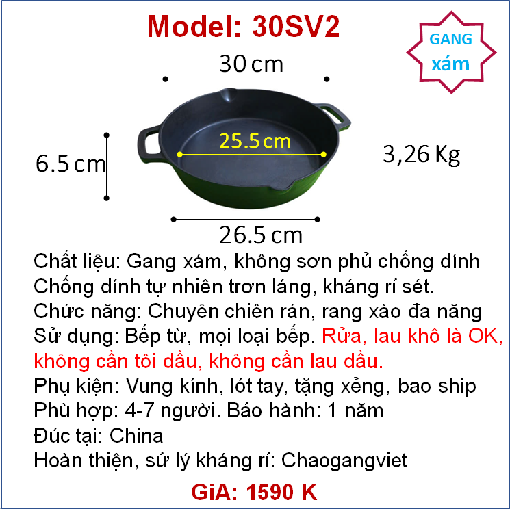 2. Thông số: Đường kính 30cm, cao 6.5cm, cân nặng ~3,26 Kg, đáy tiếp xúc bếp từ 26.5cm, lòng chảo 25.5cm.