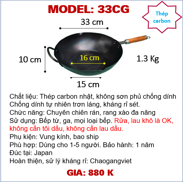 Kích thước đường kính miệng 33cm, cao 10cm, cân nặng 1,3kg , tay cầm gỗ 1 bên, có quai phụ rất tiện lợi, phù hợp cho những bếp ăn, bếp nấu của các gia đình dùng bếp từ, ga, bếp củi.
