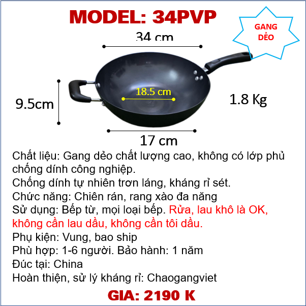 Đường kính 34 cm, cao 9.5cm, cân nặng ~ 1.8Kg, tay cầm nhựa + Vấu phụ chống nóng cao cấp, đáy tiếp xúc bếp từ 17 cm, lòng chảo 18.5 cm