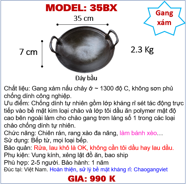 Chiếc chảo 35BX này được sản xuất tại Việt Nam, chất liệu gang xám đúc mũi cày ngày xưa.