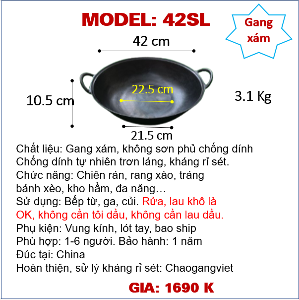 Đường kính 42cm, cao 10cm, cân nặng ~3.1 Kg, đáy tiếp xúc bếp từ 21.5cm, lòng chảo 22.5cm