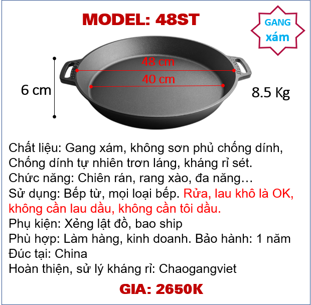 Đường kính 48 cm, cao 6cm, cân nặng ~8.5 Kg, đáy tiếp xúc bếp từ ~42 cm, lòng chảo ~40cm