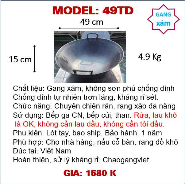 Kích thước đường kính miệng 49cm, cao 15cm, cân nặng 4,9kg , hai tay cầm 2 bên rất tiện lợi, phù hợp cho những bếp ăn, bếp nấu của các gia đình có bếp lớn, thông thoáng hay nhà vườn rộng.