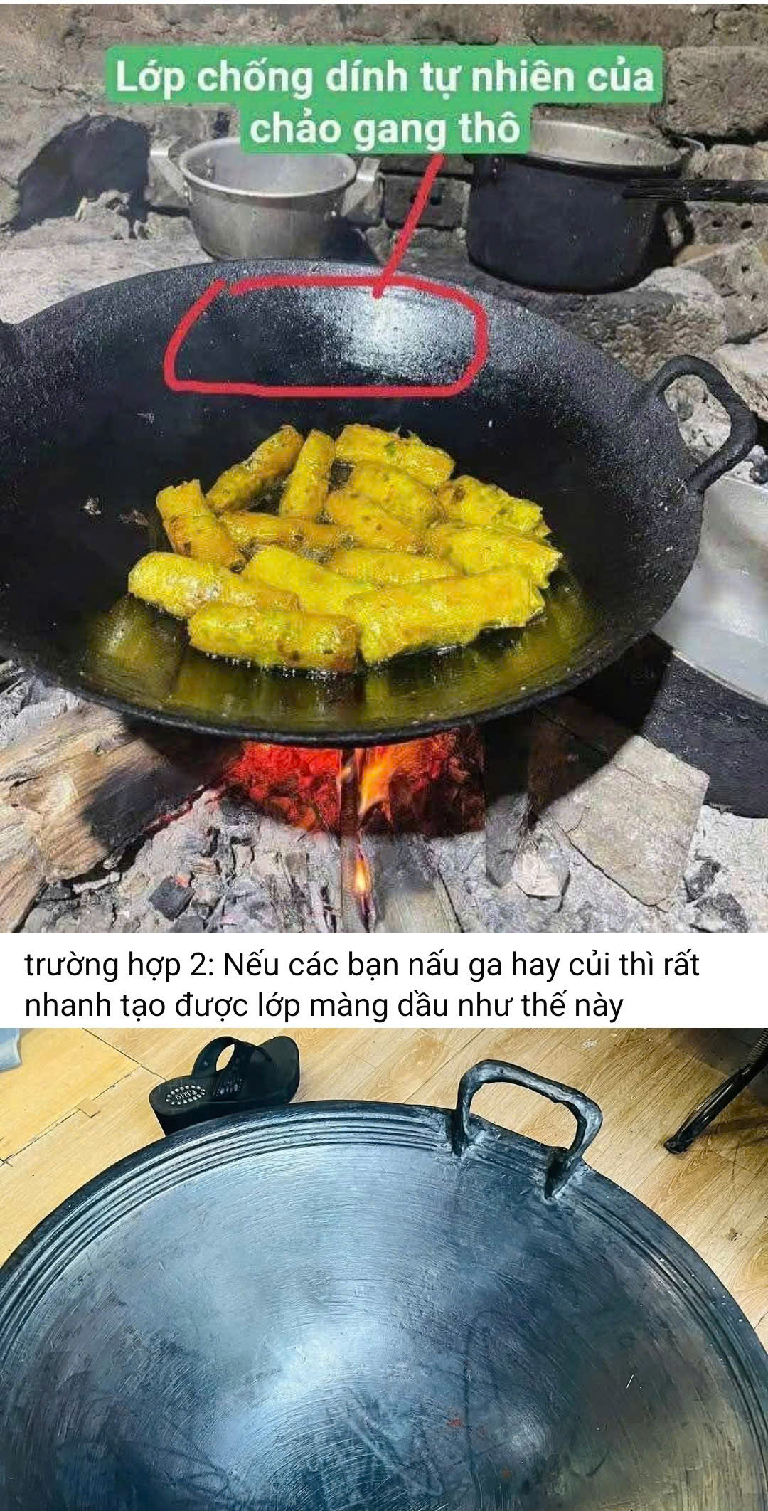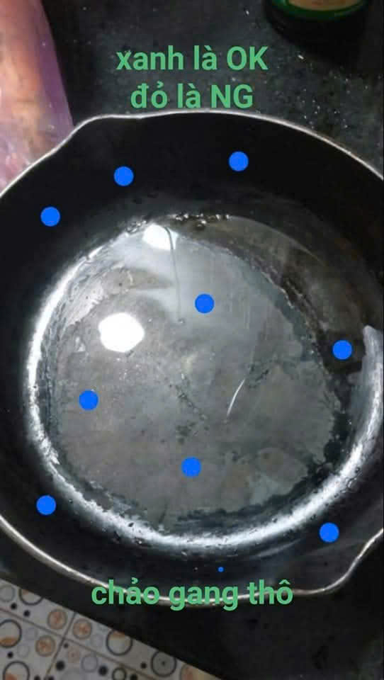 Chống dính tự nhiên của chảo gang xám (gang thô) là gì? Lâu nay chúng ta hay nghe nói chống dính tự nhiên, chống dính tự thân... là ý nói chống dính không phải do việc sơn phủ hóa chất hay phủ chống dính công nghiệp để chảo không bị dính. Chống dính tự nhiên thường được mô tả cho các loại chảo như chảo thép carbon, chảo gang xám (gang thô), chảo inox, chảo nhôm. Mình tìm hiểu và ứng dụng trong quá trình sử dụng chảo gang xám (ảnh kèm theo) thì thấy rằng, hiểu đơn giản về chống dính tự nhiên, nó chính là sản phẩm của dầu ăn phản ứng với nhiệt độ trong quá trình ta chiên rán đồ ăn liên tục lặp lại, mỗi lần chiên rán sẽ có 1 lớp màng dầu lưu lại trên bề mặt chảo gang, 1 lượng nhỏ dầu ăn phản ứng và bám lại thành chảo. Hiểu đơn giản hơn nữa chính là lớp cháy két lại của dầu ăn, nó giống như việc khói đen bám vào nồi chảo khi ta nấu củi ở quê ngày xưa. Như ảnh đính kèm thì chấm xanh là lớp chống dính tự nhiên đã hình thành, cần giữ và duy trì. Chấm đỏ là vị trí bị rỉ sét do bảo quản chưa đúng. Việc rỉ sét xảy ra rất nhanh với chảo thép carbon và chảo gang xám, nên ai dùng 2 món chảo đó cần hiểu về sản phẩm và cách bảo dưỡng chảo thì sẽ ok. Chấm xanh nhìn màu sắc nó nâu, đen, thâm nhưng là bình thường với chảo thép carbon và chảo gang xám, chứ không phải bẩn theo đúng nghĩa? Bởi cái chảo nào có được nhiều chấm xanh hay toàn bộ xanh (toàn bộ phủ lớp màng dầu màu đen) là cái chảo có lớp chống dính tự nhiên tốt rồi, dùng không bị rỉ sét, không bị cháy hay dính chảo, dùng đa năng chiên rán xào nấu canh thoải mái mà không bị rỉ trong quá trình nấu ăn. ????Tại sao ta nói nhìn nó thâm đen mà ko phải bẩn? cách thử chính là rửa chảo, lau khô 1 vài lần bằng giấy ăn, ta sẽ thấy giấy ăn vẫn trắng tinh, không bị vết rỉ vàng thôi ra là Ok, thực tế muốn cọ các vết xanh đó đi ta phải dùng lực mạnh như máy mài tay mới phá được. ????Bảo sao người ta nói, dùng chảo gang xám nó bẩn bẩn một tí mới đúng bài (ý nói về màu sắc) , nếu bạn chăm chăm đánh cho cái chảo gang sáng trắng ra là sai lầm. ????Phần sử dụng và bảo dưỡng thì phụ thuộc vào tình trạng thực tế của cái chảo là mới dùng hay dùng lâu, kinh nghiệm, cách dùng của bạn, tần suất sử dụng...